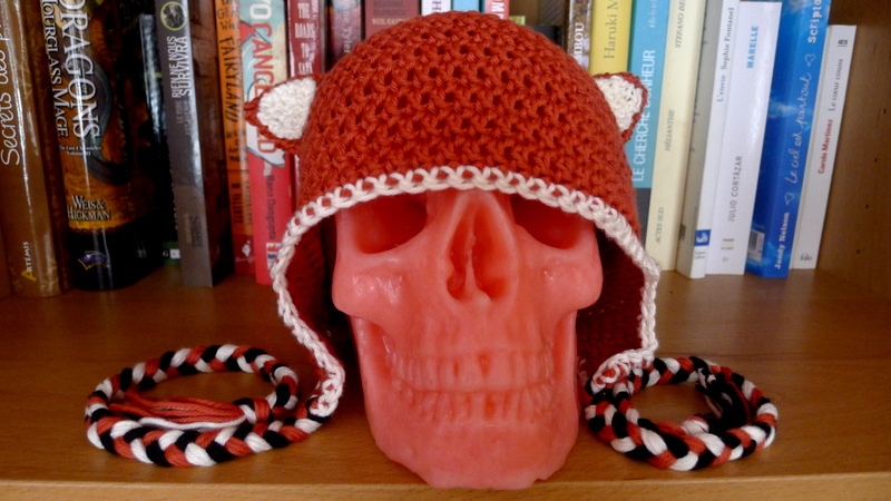 Ah, je comprends mieux le débat sur la longueur des oreilles ! ^^ Je le trouve parfait, ce bonnet, j'aime beaucoup aussi ses cordons noirs, blancs et roux.