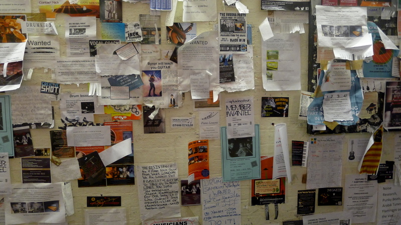 La seconde cache remarquable de cette série s’appelle « The tin pan alleyband ». Dans une ruelle couverte, à côté d’un célèbre marchand de guitares, se trouve un immense panneau d’affichage où des groupes de musiciens en quête de nouveaux membres viennent poster leurs annonces. La cache y est dissimulée d’une façon particulièrement astucieuse, que je ne dévoilerai pas ici pour ne pas gâcher le plaisir des autres géocacheurs parmi vous; sachez juste qu’un regard (très) affûté pourra l’apercevoir sur une de mes photos.