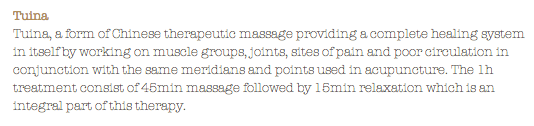 Voici ce que l’on peut lire concernant le Tuina sur le site internet du spa: