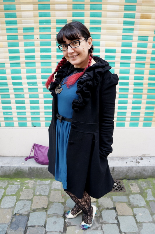 En fait, avec des bas unis et tes cheveux flashy, ça aurai fait "petite-fille-sage-mais-pas-tant-que-ça", avec un visuel fort sur les extrémités (ta tête et tes pieds, quoi!) tandis que là, les collants brouillent cet effet…