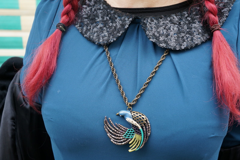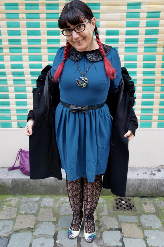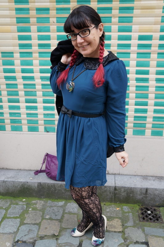 La remarque sur les collants est très pertinente. En fait, je les ai choisis au moment où je pensais porter la robe avec de simples escarpins turquoise; du coup, ils ajoutaient un élément intéressant à la tenue. Et puis au dernier moment, j'ai changé de chaussures sans penser que ça n'irait plus bien avec ces collants.