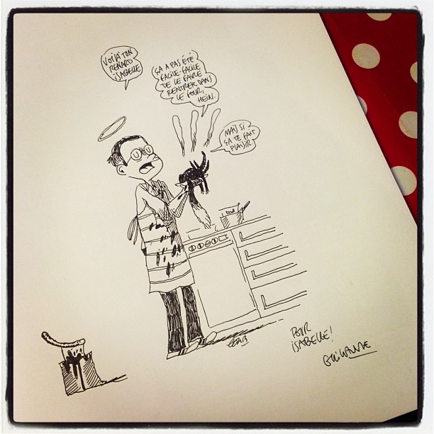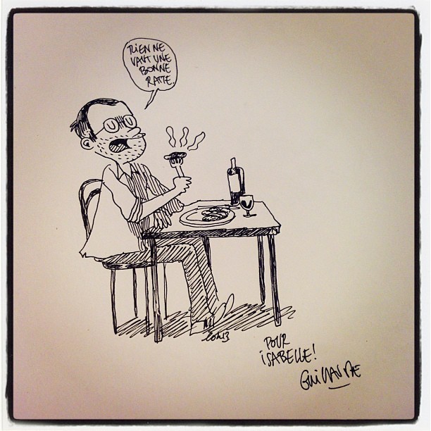 Depuis que j’ai, grâce à une recommandation de Funambuline, découvert « A boire et à manger », génial recueil de bédé culinaire, j’ai envie de rencontrer son auteur pour qu’il dédicace mon exemplaire. Plusieurs fois, j’ai joué de malchance: il passait à Monpatelin pendant que j’étais à Bruxelles, ou l’inverse; ou encore, il faisait une apparition en Gruyérie la semaine suivant mon séjour là-bas. Mais cette fois, avec sa participation à la Foire du Livre, j’étais certaine d’arriver à mes fins!