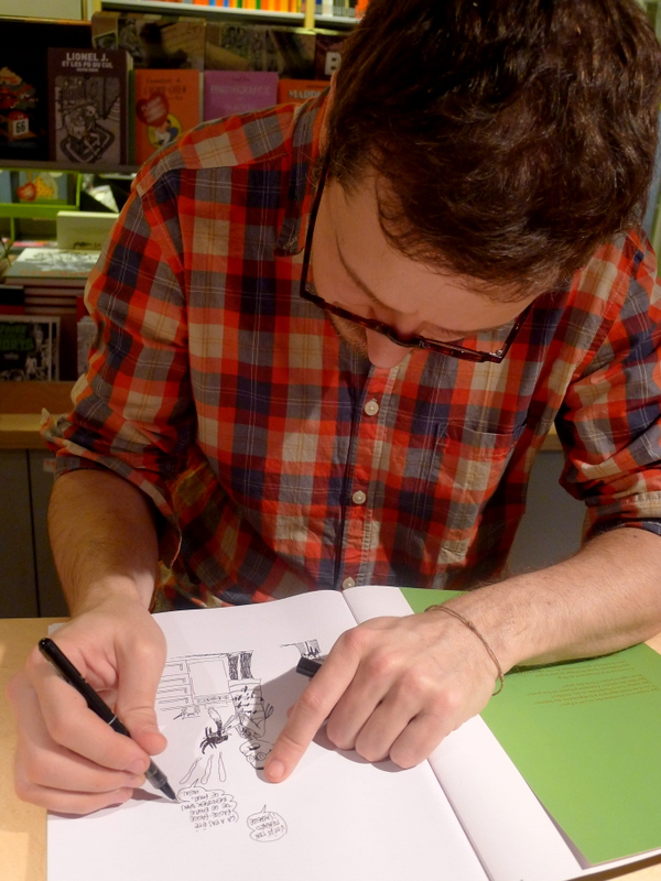 Mais il en faut plus pour me décourager. Je traîne ma pauvre carcasse transie jusqu’au métro en priant pour arriver à Filigranes avant le départ de Guillaume Long. Quand je déboule dans la librairie, remontée comme un coucou gruyérien, il n’y a personne au fond de l’espace-buvette où les auteurs dédicacent d’ordinaire. Chouchou, qui m’a rejointe à l’entrée, suggère d’aller voir au rayon bédé. Là, les ouvrages de Guillaume Long traînent ostensiblement sur une table, mais Guillaume Long lui-même demeure insaisissable. Je me renseigne auprès d’une libraire: « Non, je ne pense pas qu’il soit parti, sa veste est toujours là ». Avec la chance que j’ai, il l’aura juste oubliée…