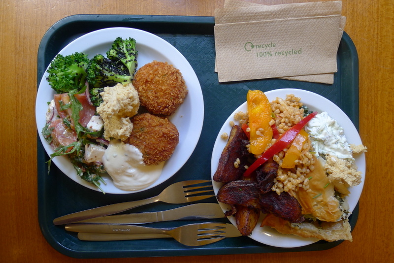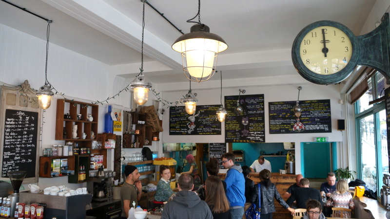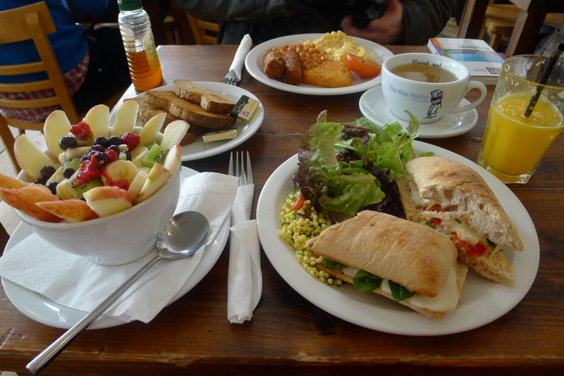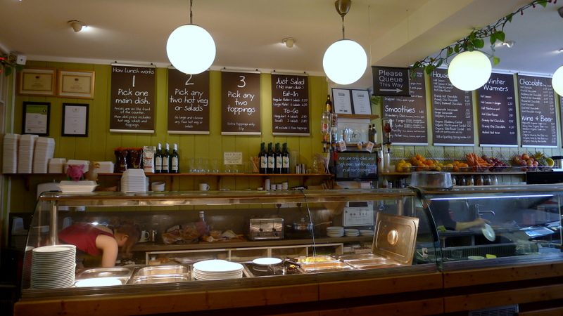 Autre café végétarien choisi au hasard pour notre lunch de dimanche. J’ai été TRES inspirée sur ce coup-là, et chanceuse que la meilleure table – tout au fond, près de la fenêtre qui donne sur une palissade en bois couverte de végétation grimpante – se libère pile au moment où nous arrivions. Il était trop tard pour une des formules petit-déjeuner pourtant très alléchantes, mais nous n’avons pas perdu au change avec la formule lunch: un plat principal + deux accompagnements + deux toppings au choix pour environ £7. Nous avons pris une spanakopita (épinards et fêta dans une croûte de pâte filo) et de grosses boulettes de brisures de riz/petit pois/fromage de chèvre panées. Tout était à tomber par terre niveau goût et fraîcheur, avec de plus des serveuses souriantes et adorables qui appellent les clients « love ». Du coup, je ne voulais plus quitter Brighton!