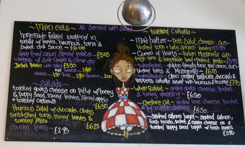 C’est ma grosse faiblesse pour l’univers d’Alice au Pays des Merveilles qui, samedi en fin de matinée, nous a conduits dans ce café végétarien bobo-branché. Nous y avons fait un brunch délicieux, dans une salle lumineuse et peu bruyante. Mention spéciale aux saucisses sans viande, au muësli aux fruits frais et aux ciabatta à thème, ainsi qu’au bocal à pourboires orné d’une figurine de licorne et de la mention: « If you don’t tip, the unicorn gets it! ».