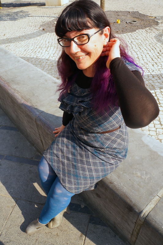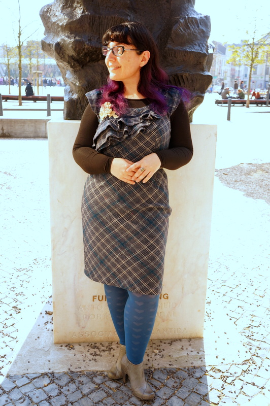 La statue de Fernando Pessoa était réapparue aussi mystérieusement qu’elle s’était volatilisée voici quelques mois, et à vrai dire la lumière était un peu trop crue pour faire des photos potables. Mais j’avais envie d’immortaliser cette robe en tweed qui me ressemble si peu et que j’adore pourtant, et Chouchou a gentiment accepté de se prêter au jeu.