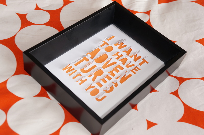 Le texte, formaté sur Photoshop et « retourné » par Chouchou, a d’abord été imprimé à l’envers au dos du Canson blanc, en lettres évidées (= seulement le contour) et très pâles. Puis je me suis armée d’un cutter et de patience afin de découper séparément chaque lettre, laissant juste le trait de gauche intact pour créer une sorte de charnière d’un coup de plioir. C’est un processus qui réclame une certaine minutie et beaucoup de patience! Le résultat est loin d’être parfait, mais je trouve qu’il donne très bien, surtout dans ce cadre à effet « perspective ».