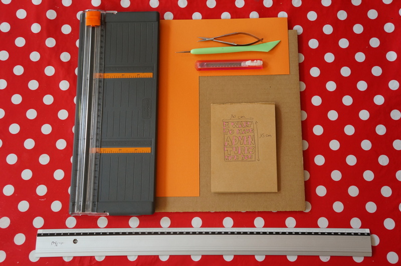 Fournitures: une feuille de Canson blanc, une feuille de Canson orange, un cutter normal, un cutter tournant ou un ciseau de scrap, une règle en métal, un tapis de découpe, un plioir. Optionnel: un mini-massicot.