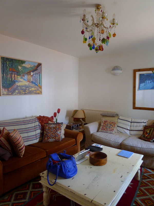 A 17h30, comme le tarif du parking n’augmentait plus entre 5 et 24h, nous avons décidé de laisser notre voiture en ville où nous comptions redescendre pour dîner, et nous sommes montés à pied jusque chez notre logeuse, ce qui nous a pris entre 30 et 40 minutes au lieu du quart d’heure annoncé. A notre arrivée, notre logeuse s’est répandue en excuses: elle avait oublié son portable au boulot et n’avait pas eu nos messages. Sa « place de parking » était bien dans l’allée devant la résidence, malgré l’absence de marquage au sol. Spontanément, elle a proposé de nous rembourser nos frais de parking en ville par Paypal. Puis elle nous a fait faire le tour de l’appartement qui était aussi charmant que prévu, plein de piles de bouquins, de poèmes et de dessins. A en juger le contenu de sa cuisine, elle aussi est très branchée alimentation saine! Le wifi fonctionnait parfaitement; les deux canapés du salon étaient moelleux à souhait, et la couette semblait bien douillette. Sur ce point, satisfaction totale. Par contre, au moment de retourner en ville à pied, j’ai commencé à grincer des dents genoux.