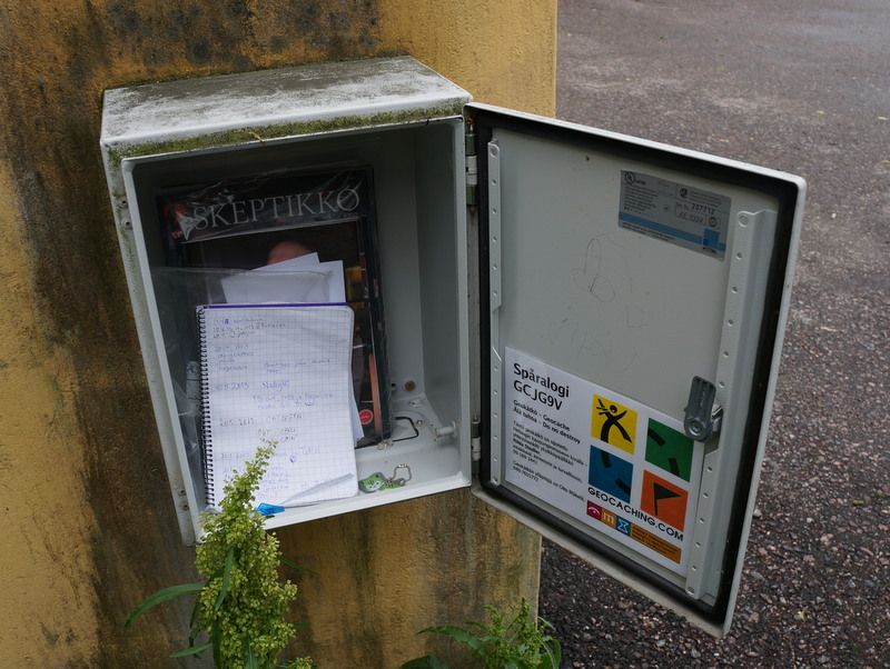 A Helsinki, elles sont nettement moins nombreuses, et les auteurs d’une bonne moitié d’entre elles ne se sont pas donné la peine de traduire leur fiche en anglais – ce qui est particulièrement embêtant quand il y a une énigme à résoudre pour obtenir les coordonnées GPS, et ici, c’était souvent le cas. Ma liste de pré-sélection était donc assez courte, mais elle comportait pas mal de caches de taille 2 ou supérieure, ce qui est d’ordinaire très rare en milieu urbain et toujours plus excitant. Parmi ces caches, deux m’ont particulièrement plu… (Même si vous pouvez lire leur vrai nom sur mes photos, je ne le mentionne pas dans mon texte pour éviter de spoiler d’autres géocacheurs qui feraient des recherches sur Google.)