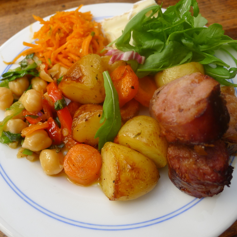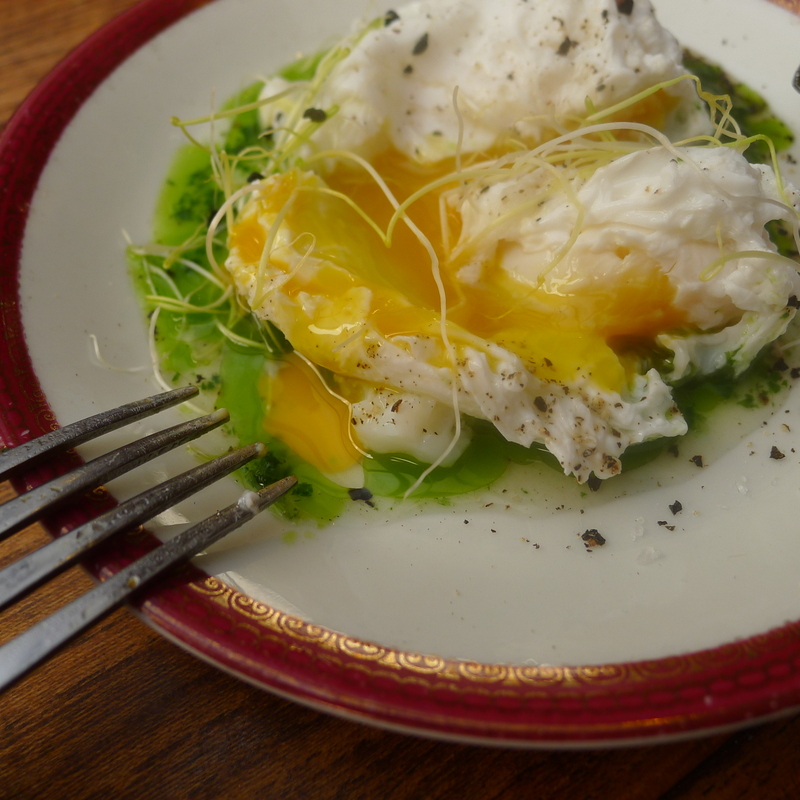 Même si nous avons réservé, la jolie petite terrasse ombragée est déjà pleine quand nous arrivons à midi et demie. Mais on nous attribue une table juste entre le buffet et le meuble à casiers plein de brols chinés en brocante – nous ne perdons donc pas au change. Ici, la formule brunch comprend: une boisson chaude, un jus d’orange ou de pomme (en bouteille, pas frais pressé), un oeuf poché à l’huile d’olive et bien sûr l’accès au buffet sucré-salé. Au premier abord, celui-ci peut paraître sommaire. En entrées froides: roquette, carottes râpées, salades pois chiche/poivrons. En plat chaud: saucisse grillée, pomme de terre grenaille et carottes sautées. En dessert: fromage blanc avec coulis de fruits rouges, crumble pomme/mûre, cubes de pastèque et d’ananas. Mais tout est frais, de bonne qualité et délicieux. Surtout, un choix plus restreint évite la tentation du goinfrage et permet de proposer un prix raisonnable: 17€.