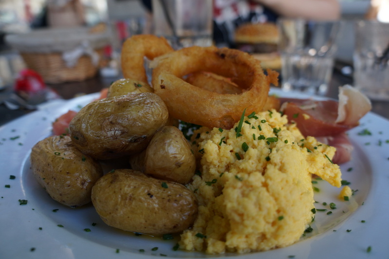 Arrivés à midi pile, juste avant le rush, nous avons tous les trois opté pour une formule salée à 20€ comprenant orange pressée ou smoothie, boisson chaude (possibilité de thé à la menthe fraîche ou de vrai chocolat chaud avec des pastilles à faire fondre dans du lait mousseux), 3 mini viennoiseries, 1 tartine de pain brun avec au choix Nutella, beurre, miel ou confiture, le tout suivi d’un plat chaud au nom de gangster et d’un dessert.