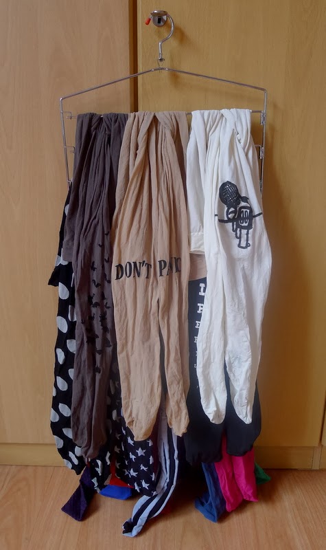Après avoir enlevé les petites protections en plastique rouge, j’ai mis chaque collant à cheval sur une barre, glissé les jambes dans l’ouverture formée par le gousset de l’autre côté de la barre et tiré pour obtenir une sorte de « noeud » super facile à défaire. Je vous concède que visuellement, ce n’est pas d’une grande esthétique. Mais je m’y retrouve beaucoup plus facilement dans mes collants fantaisie, et mes collants utilitaires (noirs opaques, chair transparents) ont pu reprendre leur aise dans leur boîte!