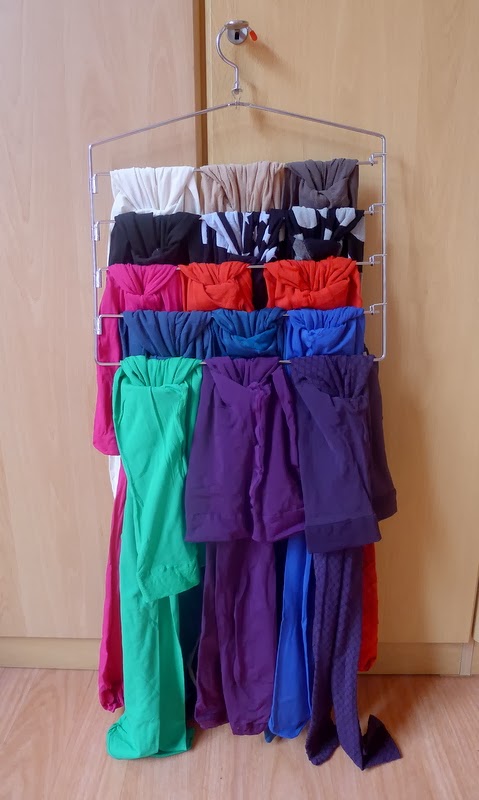 Dans mes objectifs de septembre, il y avait « Trouver un nouveau moyen de ranger mes collants ». En effet, prise d’une subite passion pour les collants colorés l’hiver dernier, j’en avais accumulé bien davantage que ma boîte dédiée ne pouvait en contenir, et ils commençaient à envahir tout le bas de ma penderie. Une lectrice a mentionné qu’une de ses amies suspendait les siens sur cintre, et j’y ai aussitôt vu l’occasion d’utiliser le second cintre multiple du lot de 2 acheté pour ranger mes masking tapes.