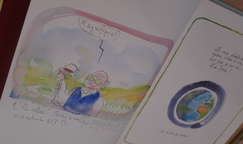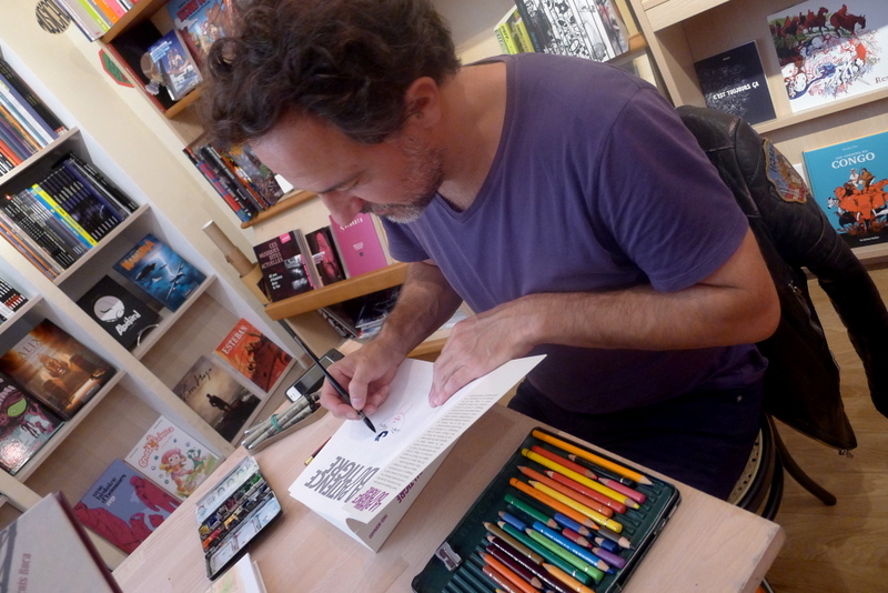 C’est toujours un plaisir de rencontrer un auteur dont on aime le travail, dans des circonstances où on a vraiment la possibilité de discuter avec lui. Contrebandes offre un cadre idéal pour ça avec son espace « salon » meublé de fauteuils en velours, et Fred Bernard est du genre à bavarder volontiers en dessinant. Son éditeur venait de le forcer à ouvrir sur Facebook une page d’auteur qu’il ne savait absolument pas comment gérer; en vieille routarde, je me suis donc fendue de quelques conseils avisés avant de le laisser à ses fans suivants. Et je suis repartie ravie de cette sympathique rencontre.