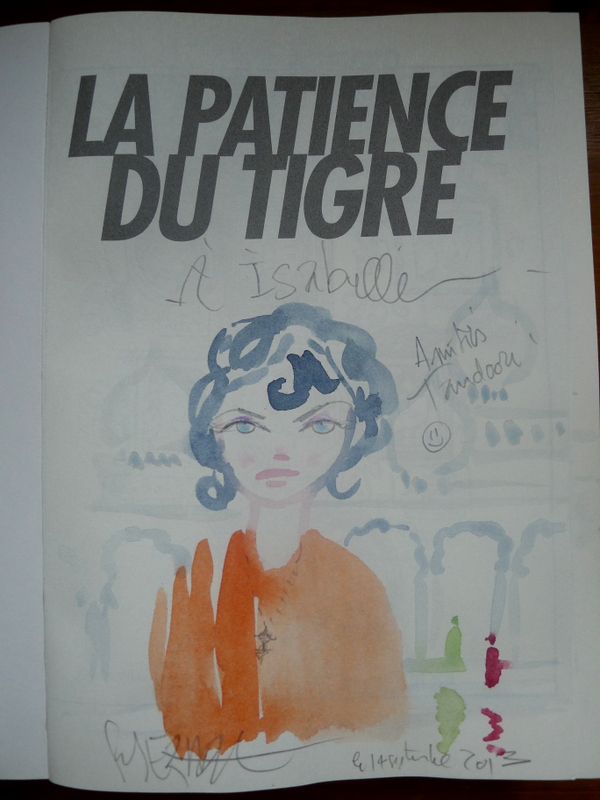 Cette semaine, le Dieu des amateurs de bédé était de mon côté: Fred Bernard, auteur des aventures de Jeanne Picquigny et des récentes « Chroniques de la Vigne« , dédicaçait samedi après-midi dans ma librairie monpatelinoise préférée. Théoriquement, il était là pour les livres jeunesse qu’il co-signe avec François Roca, mais il a gentiment accepté mon exemplaire de « La patience du tigre » pour l’orner d’une très belle aquarelle représentant son héroïne.