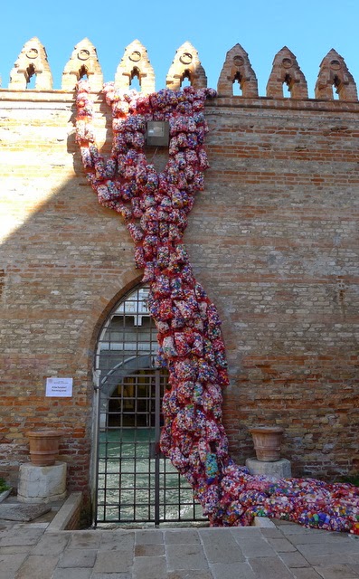 L’auteur de cette série de caches dit avoir voulu entraîner les touristes hors des sentiers battus. Pari réussi, puisque notre recherche nous a conduits dans une petite cour si bien dissimulée au fond d’un labyrinthe de passages étroits que l’on n’y entendait plus aucun bruit extérieur. Alors que nous scrutions les murs le plus discrètement possible, une dame d’âge mûr est apparue à sa fenêtre. J’ai cru qu’elle allait nous s’enquérir sur un ton méfiant de ce qu’on foutait ici; en fait, elle nous a demandé si on était là pour la cache. Comme nous acquiescions, soulagés, elle nous a indiqué la gouttière dans un coin. Je ne sais pas dire « Méheuuuu, c’est de la triche » en italien; aussi, je me suis contentée de sourire, de remercier et d’aller extirper le tube de son trou.