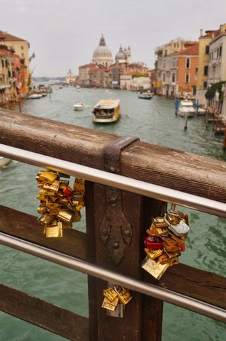 Le Grand Canal serpente à travers le coeur de Venise, qu’il coupe plus ou moins en deux. Il n’existe que quatre ponts permettant de le traverser. Deux d’entre eux se trouvent au nord, loin des quartiers touristiques. Les deux autres sont le célèbre Pont du Rialto, qui se compose d’une galerie marchande fermée au milieu et de deux passerelles à ciel ouvert sur les côtés, et le Pont de l’Académie, plus traditionnel, aux rambardes surchargées de cadenas laissés là par des couples d’amoureux. Comme c’était le plus proche de notre location, nous y sommes passés tous les jours, à tous les heures et par tous les temps…