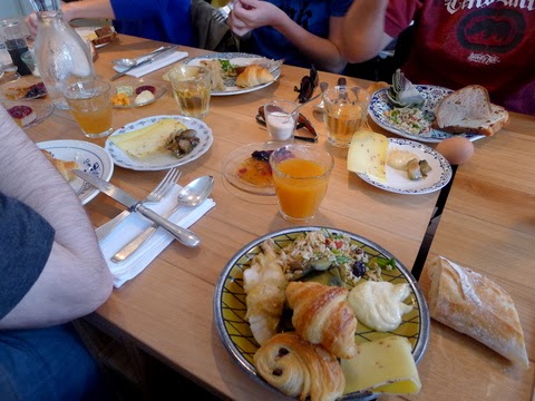 Le buffet sucré-salé, avec service à volonté et succession de plats différents au fur et à mesure que les précédents se vident, coûte seulement 15€. Les boissons sont en sus. Ce jour-là, en plus des mini-viennoiseries, du cramique et de l’assortiment de pains et de confitures, nous avons dégusté une soupe de légumes verts, des artichauts croquants, de la salade de riz et de poivrons rouges, du poulet mijoté en cocotte, des boulettes sauce tomate, un fromage inconnu avec des graines dedans et un clafoutis aux reine-claude. Il y avait d’autres délices encore, mais contrairement à ce que certaines mauvaises langues auraient pu insinuer, nos estomacs n’ont pas une contenance infinie.