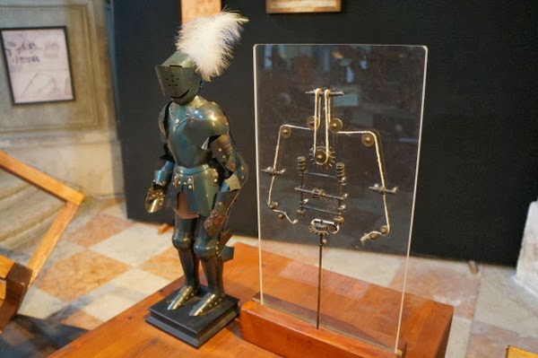 Et de fait, cette exposition très bien conçue a été une pure source d’émerveillement. Dans la première partie, les grands principes de physique découverts par Leonard de Vinci (notamment, la manière de transformer une force rotatoire en force verticale ou horizontale, ou celle de démultiplier une force à l’aide d’un système de poulies) sont illustrés par des mécanismes tout simples que le visiteur peut actionner lui-même en tournant une poignée. Pour une ignare curieuse dans mon genre, c’était hyper instructif. Tout comme le fait de découvrir leurs applications pratiques, qui font entre autres de Leonard de Vinci le concepteur de la première bicyclette ou du premier automate.