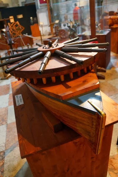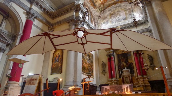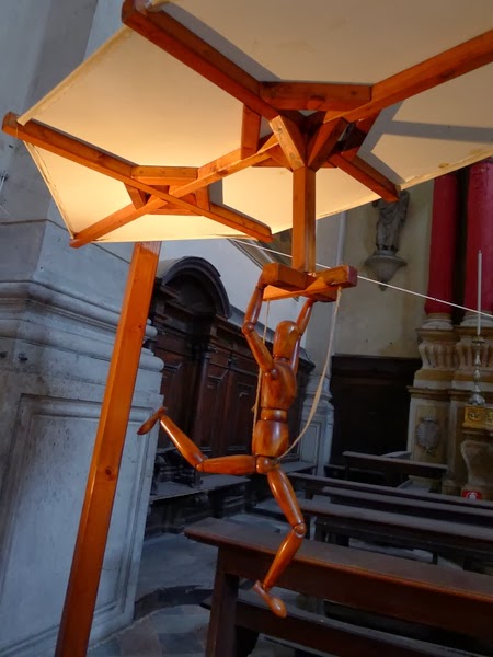 La plus chouette expo de ce voyage, on l’a trouvée un peu par hasard, en traversant le campo San Barnaba un soir où on était bien crevés et où mes pieds menaçaient de se mettre en grève illimitée. Devant l’église se dressaient une aile en toile sur armature de bois et une affiche avertissant qu’à l’intérieur, on pouvait admirer des machines interactives reproduites à partir des écrits de Leonard de Vinci. Chouchou et moi étant tous deux de grands admirateurs du bonhomme, on ne pouvait pas manquer ça!