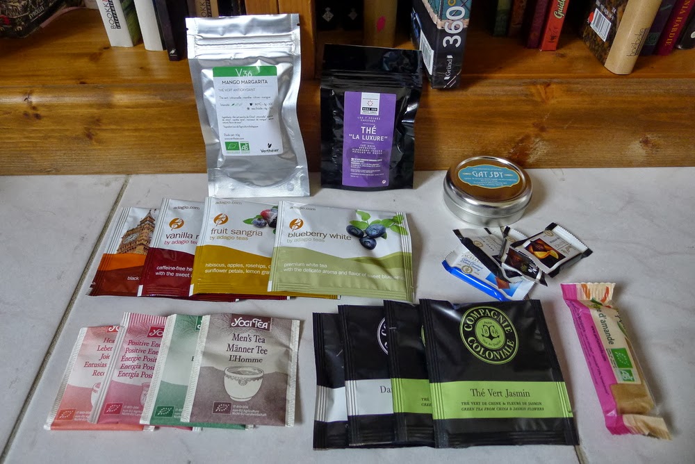 – 4 sachets individuels d’Adagio: Blueberry White (blanc à la myrtille, ça se goûte!), Fruit Sangria (infusion contenant notamment de l’hibiscus, no way), Vanilla Rooibos (rooibos à la vanille: pas pour moi merci), Earl Grey (là aussi, je passe)