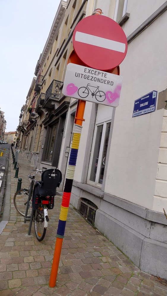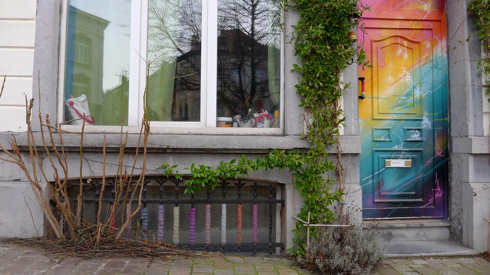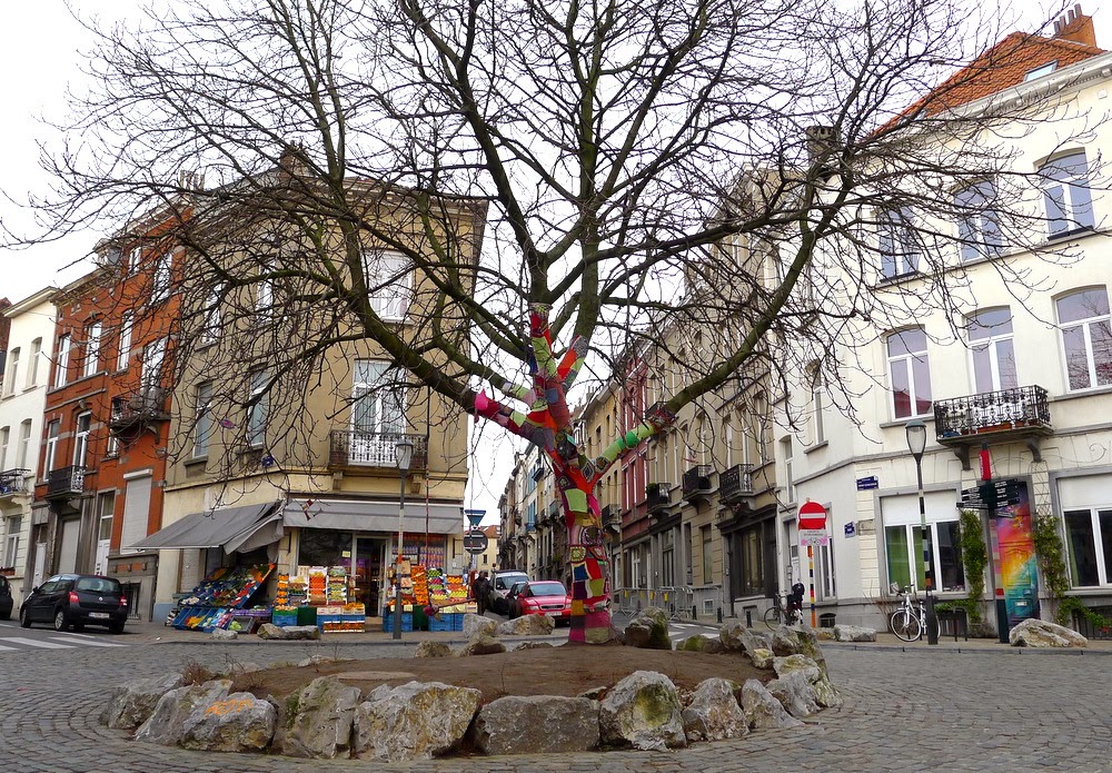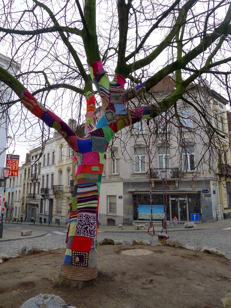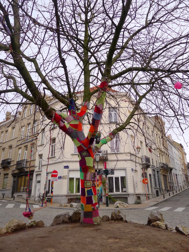 Le groupe Yarn Bombing Bruxelles, dont je vous avais déjà montré l’installation réalisée devant la gare du Luxembourg, a également sévi sur la place Henri Conscience, à deux pas de notre ancien appartement de la rue Maes. Le tronc et une partie des branches de l’arbre central ont été enveloppés de carrés multicolores (dont un code QR que nous n’avons pas réussi à faire fonctionner), tout comme les poteaux des panneaux de signalisation alentour et même les barreaux de certaines fenêtres en sous-sol.