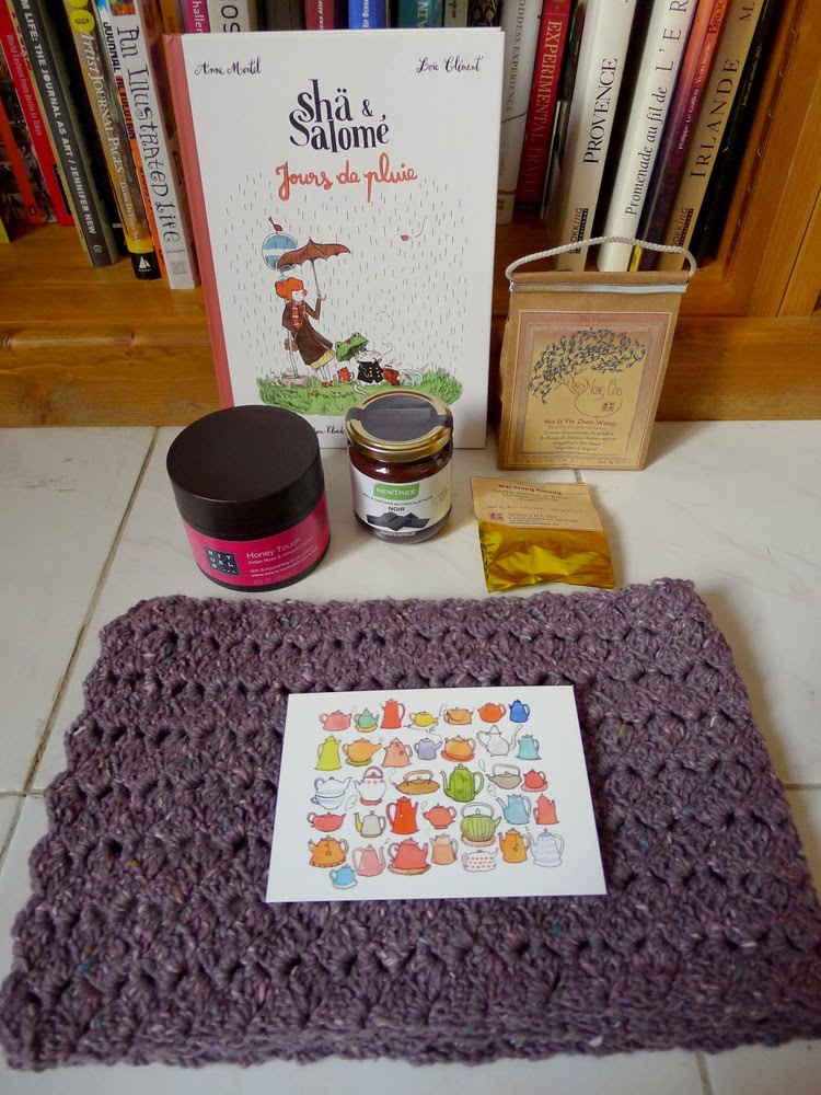 Je me souviens avoir lu ta critique de la BD et je suis très heureuse de la découvrir. Le thé me fait très envie, et je suis moi aussi l’heureuse propriétaire d’une théière en verre qui me permettra de découvrir ce thé façonné. La pâte à tartiner est un appel au crime, je ne dirai que ça (et j’aime beaucoup la marque Newtree). La crème sent divinement bon. Enfin, l’écharpe est super jolie, et ira bien avec l’un de mes manteaux… violet !