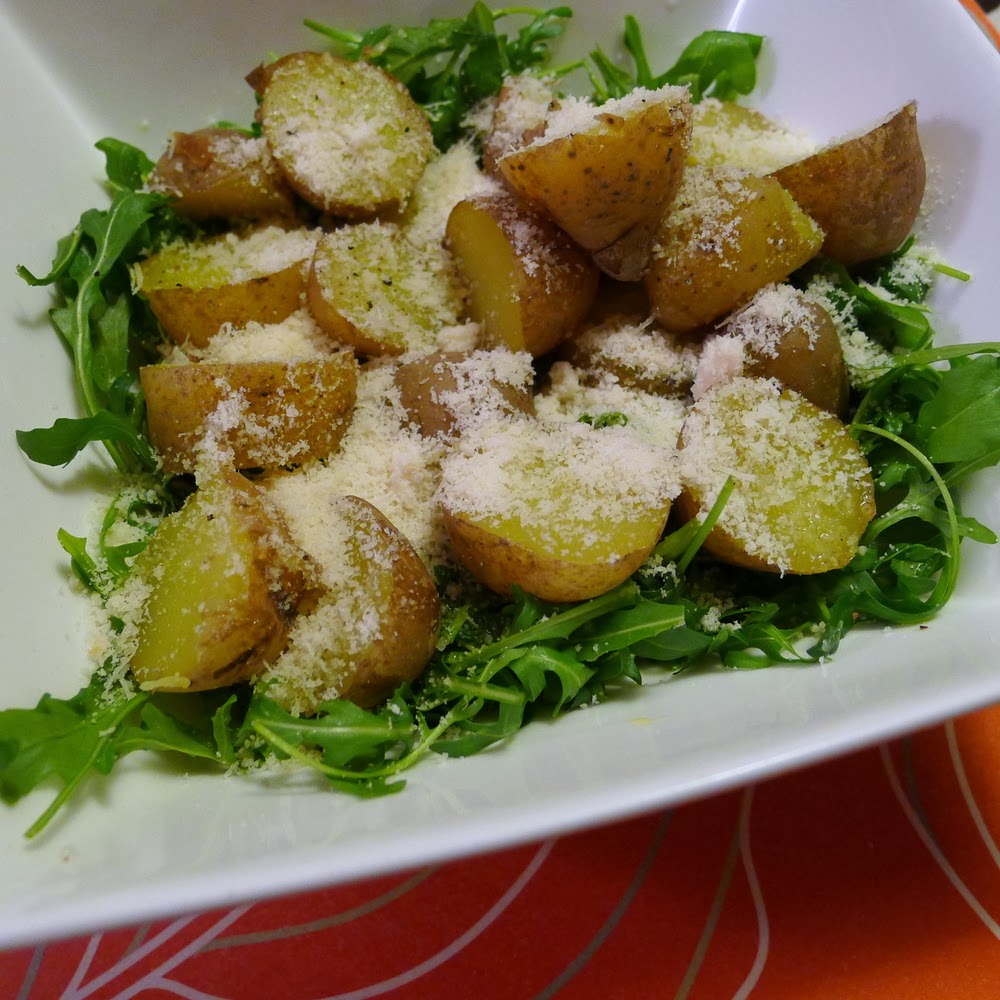 Nous faisons parfois une salade tiède similaire, avec du maquereau fumé, et sans parmesan.