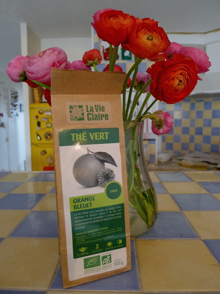 La Vie Claire, chaîne de magasins pionnière du bio en France, a fait parler d’elle au début des années 1980 lors de son rachat par Berbard Tapie. Mais pour moi, c’est avant tout le seul fournisseur de nourriture saine facilement accessible lorsque je suis à Monpatelin. J’y trouve des cracottes à la châtaigne, qui sont devenues une de mes drogues principales depuis que mon amie Isa m’en a envoyé un paquet l’été dernier, et tout un tas d’autres produits comestibles ou cosmétiques. Il y a quelques mois, j’ai ainsi fait l’emplette de ce thé, pour voir. Puis je l’ai oublié sur une étagère jusqu’au moment où j’ai décidé de puiser dans mes stocks en février.