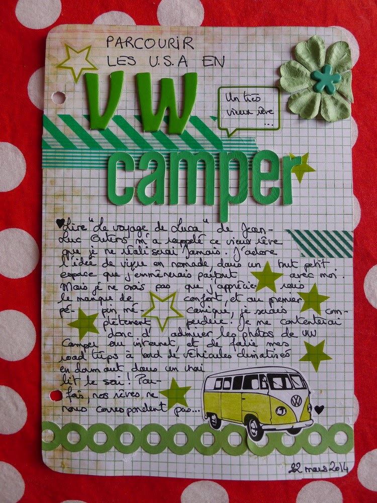 La première suggestion était « Monochrome ». Par réflexe, j’ai failli opter pour du rouge, d’autant que j’en ai beaucoup dans mes fournitures. Mais depuis 2 ans environ, je me suis prise de passion pour le vert que je n’aimais pas du tout jusque là (et qui est d’ailleurs la couleur que j’ai demandée pour le swap en cours), et j’ai eu envie de sortir un peu de mes propres sentiers battus en créant une page dans ces teintes. Au final, le plus dur a été le choix du sujet. J’ai décidé de parler d’un rêve qui ne me correspond pas: celui de parcourir les USA en VW Camper.