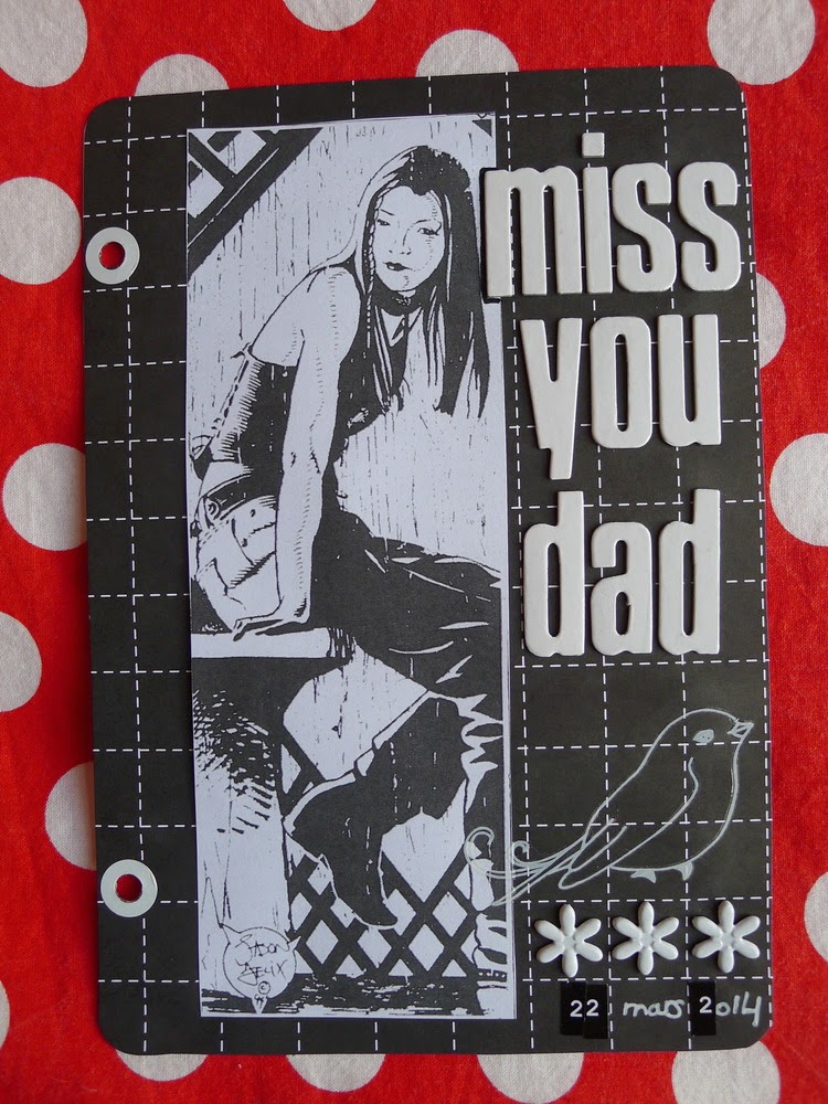 La deuxième suggestion était « Noir et blanc », ce qui de mon point de vue appelait un sujet grave ou un peu triste. J’ai eu envie d’une page simple pour dire que mon père me manquait. J’ai commencé par transformer en noir et blanc ma photo préférée de nous deux, mais le résultat composé de teintes de gris ne me plaisait pas. Au final, j’ai ressorti une vieille illustration d’un manuel de « Vampire:La Mascarade » pour laquelle j’avais eu un coup de coeur il y a… 20 ans. Photocopiée à l’époque, elle attendait sagement dans mon carton Inspirations que je trouve quelque chose à en faire. L’atmosphère qui s’en dégageait me semblait parfaite pour la page très sobre que j’envisageais.