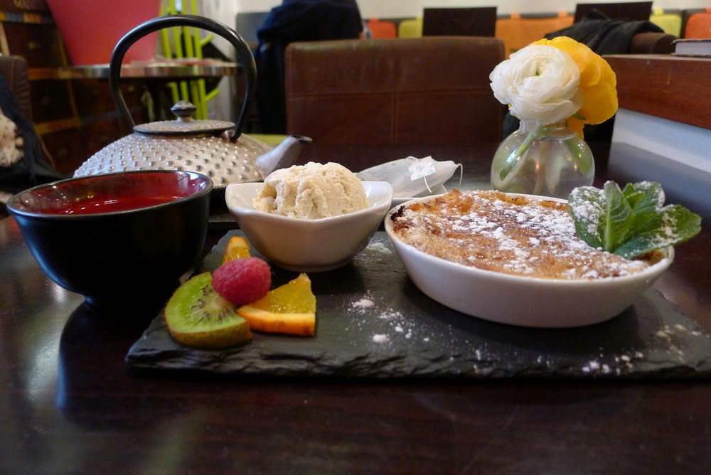 Situé à l’étage de la boutique de décoration Le Chat Rêveur, Thé Mandarine accueille ses clients dans une grande et longue salle haute de plafond dont les fenêtres surplombent la place de l’Hôtel de Ville. Le midi, on peut y faire un déjeuner sain et léger. L’après-midi, on peut y découvrir les thés Georges Cannon en les accompagnant d’une délicieuse pâtisserie maison. Hier, j’ai bouquiné pendant deux heures dans la deuxième table à gauche à partir de la fenêtre, spot que j’avais repéré comme étant le meilleur de tous car rencogné et offrant un rebord à hauteur idéale pour y poser le coude (quand on passe autant de temps que moi à lire dans les salons de thé, on développe tout un tas de critères bien spécifiques). J’ai savouré le subtil thé (blanc) mandarine qui donne son nom au lieu avec un sublime clafoutis à l’ananas frais accompagné d’une boule de glace vanille Bourbon. A un moment donné, une petite averse est tombée dehors tandis que je m’absorbais dans le roman ultra-envoûtant offert par une gentille lectrice; c’était un moment intensément cosy et juste parfait.