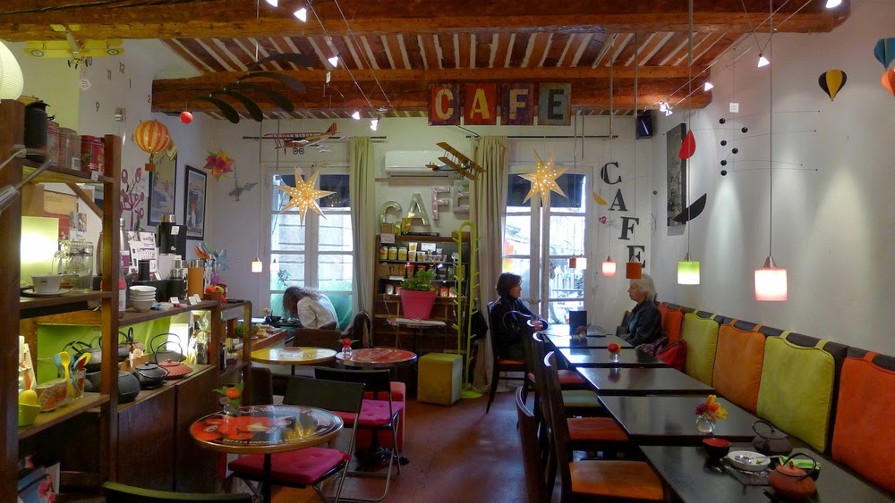 Du coup, aujourd’hui, même s’il faisait un soleil éclatant, je suis revenue finir mon livre devant une tasse d’Herbe Bleue cette fois. Comme la veille, la propriétaire des lieux m’a fichu une paix royale après m’avoir servie, et j’ai pu bouquiner au chaud et au calme. Autant dire que si j’habitais Aix, Thé Mandarine deviendrait mon indiscutable QG.