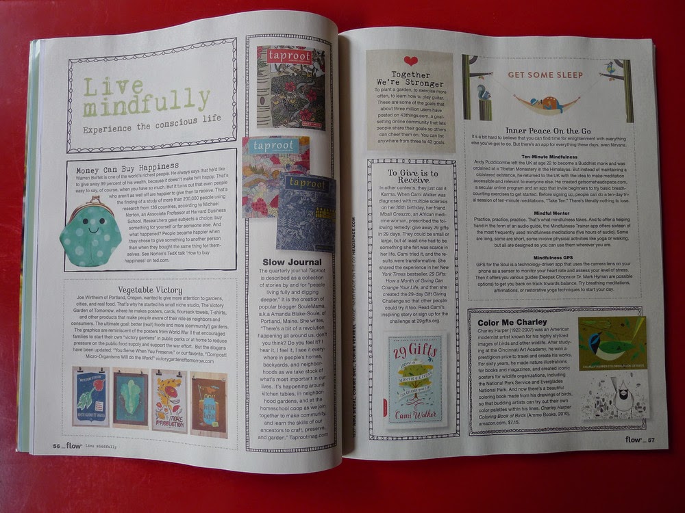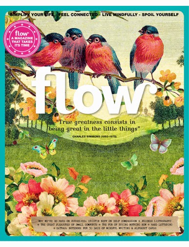Dans le #4, j’ai découpé les ex-libris autocollants ornés d’adorables animaux, puis dévoré « davantage de bonnes raisons de lire un livre », « sortez de votre zone de confort », « prenez une seule photo plutôt que des milliers », « créez votre mur d’inspiration », « n’oubliez pas de respirer » ou encore « l’art de la solitude ». La mise en page est un régal pour les yeux; les photos comme les illustrations sont magnifiques et font découvrir quantité d’artistes doués; les articles m’intéressent tous, même lorsqu’ils traitent de sujets avec lesquels je suis déjà familière, car ils proposent à la fois une vraie réflexion et des moyens concrets de mettre celle-ci en oeuvre; les paper goodies sont réellement craquants, les bonnes adresses internet pullulent, et chaque page irradie l’inspiration. Alors c’est vrai, à 12,95€ le numéro, Flow n’est pas précisément donné. Mais pour un trimestriel de 140 pages dans lequel il n’y a, de mon point de vue, absolument rien à jeter et qui m’enchante d’une couverture à l’autre, au point que je sais déjà que je vais conserver chaque numéro et le relire fréquemment, c’est un prix que je suis tout à fait prête à mettre!
