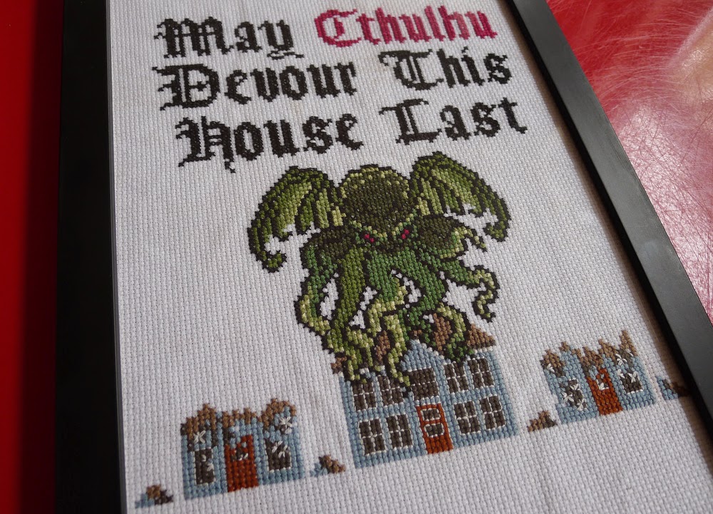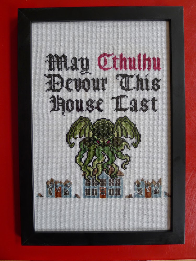 Sachant qu’en matière de DIY, je suis une sprinteuse plutôt qu’une marathonienne, je me demande bien ce qui m’a pris de me lancer dans la confection de ce point de croix Cthulhu dont les multiples teintes de vert m’ont tué les yeux. Je l’ai commencé pendant les vacances de Noël et achevé seulement lundi: c’est dire si j’ai eu du mal à en venir à bout. Sur la fin, je ne pouvais plus le supporter. Je me demande même si je vais l’accrocher – surtout que je n’ai pas trouvé de cadre vraiment adéquat et que je n’ai aucune envie de payer une fortune pour du sur mesure. Je ne veux plus voir de point de croix pendant six mois au moins. Ou alors, seulement des petits motifs kawai et colorés.