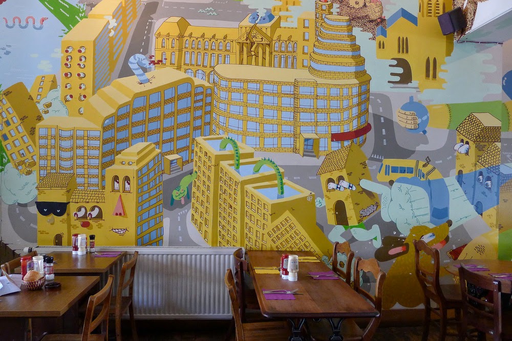 La première chose qui frappe quand on entre, juste après le joli paillasson sur lequel je me suis empressée de photographier mes pieds, ce sont les peintures murales exubérantes qui m’ont rappelé celles de chez Houtsiplou. La deuxième chose qui frappe, c’est l’odeur de graillon en provenance de la cuisine ouverte qui flotte dans toute la salle malgré la porte et les fenêtres grandes ouvertes, ainsi que l’affluence très modeste à cette heure-là. Je n’ose imaginer ce que ça doit être les samedi soirs d’hiver quand le restaurant est bondé… (Le jour de ma visite, malgré tout, ça restait très supportable.)