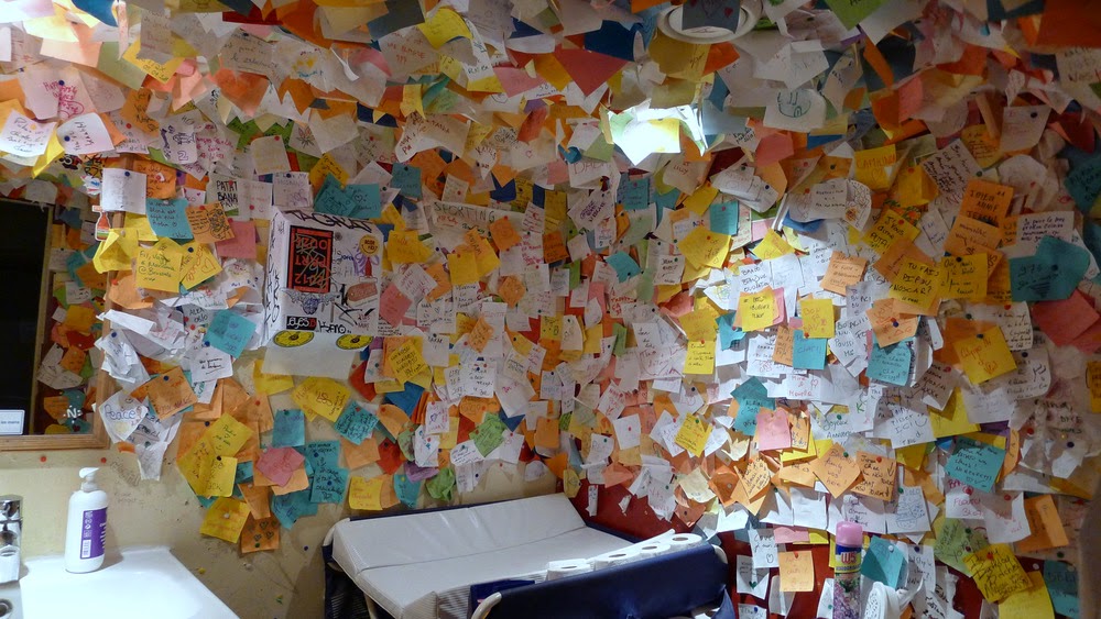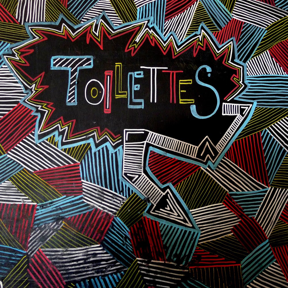 Avant de partir et sur recommandation de la charmante serveuse, je descends faire un tour aux toilettes, qui sont tapissées de petits mots et valent effectivement le coup d’oeil. Si jamais vous passez par Les super filles du tram dans les jours à venir, peut-être repèrerez-vous celui que j’ai laissé?