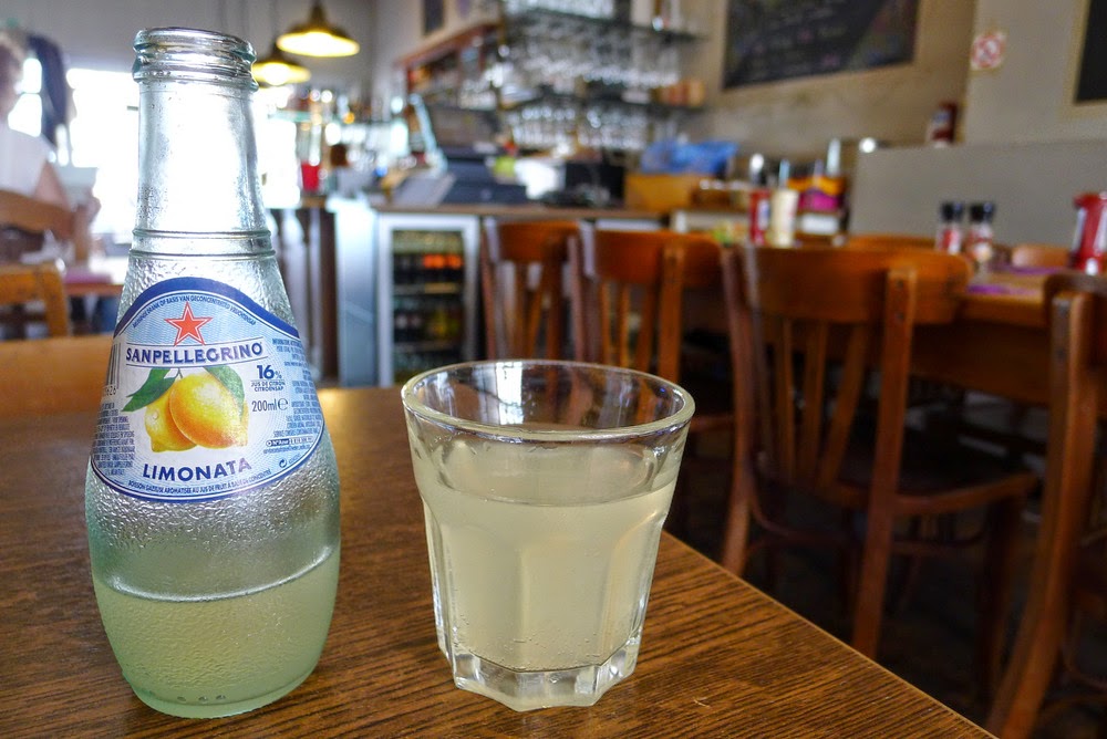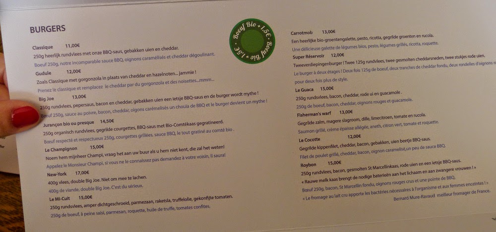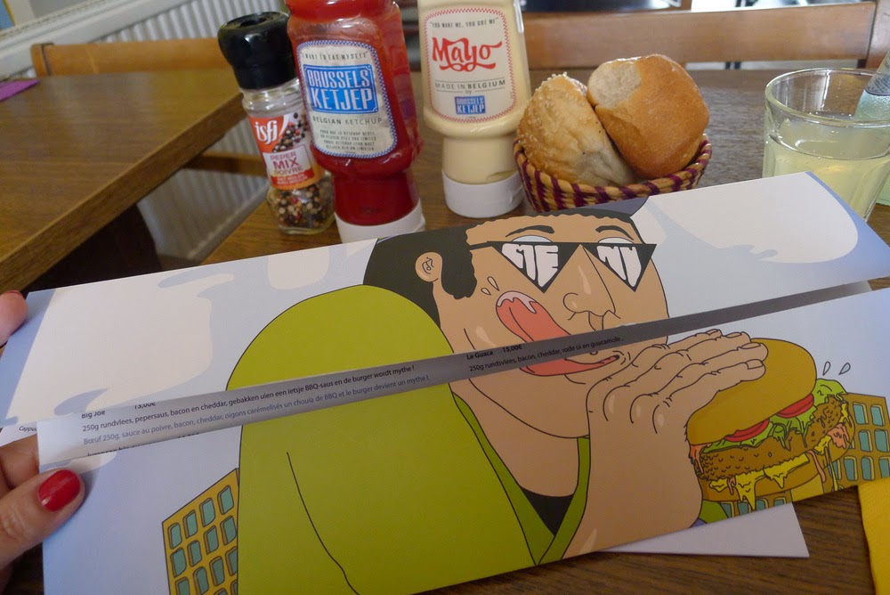 Le burger, bien que malheureusement impossible à manger avec les mains comme tous ses confrères à la garniture trop généreuse, se révèle tout à fait délicieux, avec une viande fondante, un fromage crémeux et fort en goût, une salade bien fraîche et un confit d’oignons savoureux, tous les éléments se mélangeant en bouche à la perfection. Le bun n’est pas mal non plus, ni trop épais ni trop sucré et légèrement toasté. Les frites maison, servies en si grande quantité que je n’arrive pas à les finir, ne sont pas les meilleures que j’ai mangées en Belgique mais restent très correctes. Et l’ensemble est servi avec le sourire, ce qui le rend toujours bien plus digeste! Quant à l’addition, je la trouve plus que raisonnable pour Bruxelles: 12€ le burger et 2,30€ le soda.