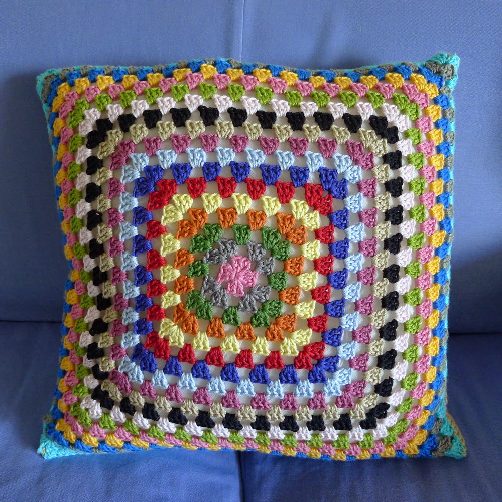 Il y a quelque temps, en tombant sur ce motif tout simple et multi-usages, j’ai décidé de le tester sur une housse de coussin, ce qui aurait le double avantage de ne pas représenter un trop gros travail et de me permettre d’éliminer une partie de mes multiples restes de Rowan Handknit Cotton. Le devant est allé vite, et j’ai trouvé ça amusant. L’arrière, que j’ai voulu écru uni et tout en brides, a davantage ressemblé à un pensum. Les deux morceaux sont assemblés à l’aide de mailles simples (sur la face intérieure, sauf pour le dernier côté après que j’ai retourné mon ouvrage). La garniture en 50×50 cm a coûté 3,95€ chez Hema, et j’ai fait ma housse un peu plus petite (45×45 cm environ) pour obtenir un coussin bien dodu.