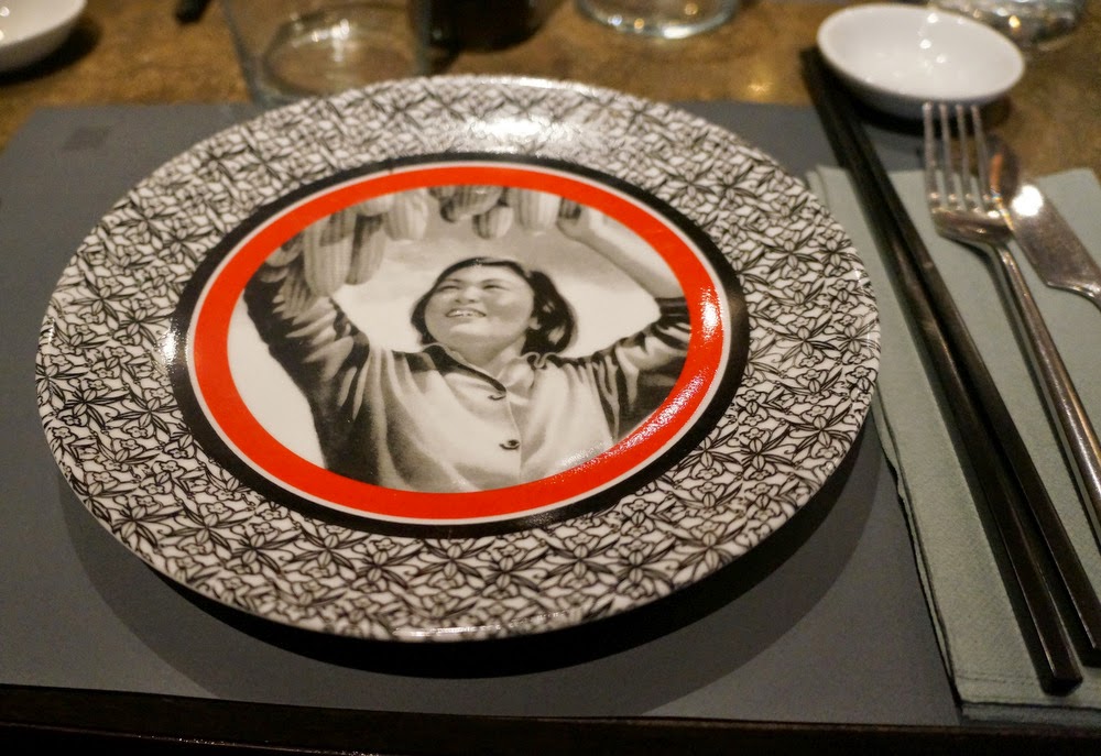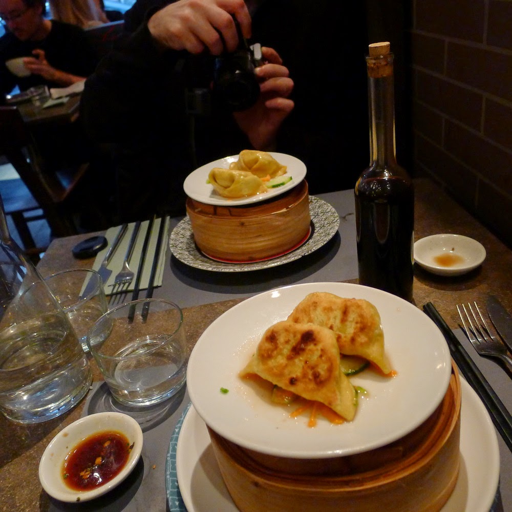 Grâce à un système de réservations internet très au point, nous avions retenu une table jeudi dernier à 20h, dans l’établissement de la rue des Martyrs. Murs de brique, profusion de lampes à l’éclairage feutré, tables grandes ou petites assez rapprochées les unes des autres, quelques banquettes turquoise brodées de rouge et un niveau sonore très acceptable même une fois la salle pleine donnent une atmosphère mi-cantine, mi-intimiste. La commande est prise et servie rapidement: d’abord les accompagnements, puis les dim sum eux-mêmes, en deux fois.