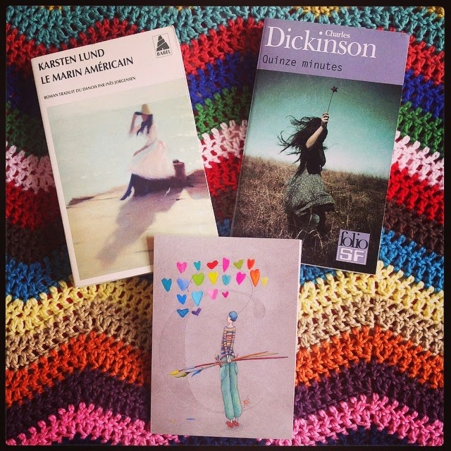 De Frédérique, qui s’est montrée très généreuse, j’ai reçu (outre une bien jolie carte et une flopée de marque-pages) « Le marin américain« , un roman danois tournant autour d’un secret de famille, et « Quinze minutes« , une histoire de voyage dans le temps qui vient de prendre la première place dans ma PAL tellement la quatrième de couverture m’a alléchée. Je ne connaissais aucun de ces deux livres, merci infiniment!