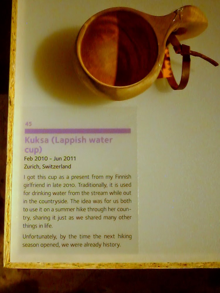 Si vous vous rendez à cette exposition, attendez-vous à lire beaucoup! Contrairement à un musée classique, ici, il semble difficile de se contenter d’admirer les objets exposés: sortis de leur contexte, ils ne composent guère qu’un étal de brocante un peu plus intrigant que la moyenne. Certains donateurs se sont contentés de quelques lignes assez vagues pour laisser la part belle à l’imagination, tandis que d’autres ont écrit une vraie tartine de plusieurs pages (parfois intéressante, et parfois pas tellement). Les raisons de leur rupture sont souvent très banales, l’infidélité et la distance arrivant en tête du hit-parade, mais on trouve aussi de vrais crève-coeur, comme l’histoire de ce beau jeune homme brun mort de maladie à 24 ans. Parfois, il est question d’une amourette de vacances, et parfois de mariages qui ont duré plusieurs décennies. Parfois même, il ne s’agit pas d’une relation avec un autre être humain, mais d’une dépendance à la bière, d’une obsession pour son poids, d’un rapport à la religion ou d’une nostalgie pour un pays dont on est originaire sans y avoir jamais vécu. L’ensemble est tour à tour émouvant et ennuyeux, un peu comme l’humanité prise dans son ensemble!