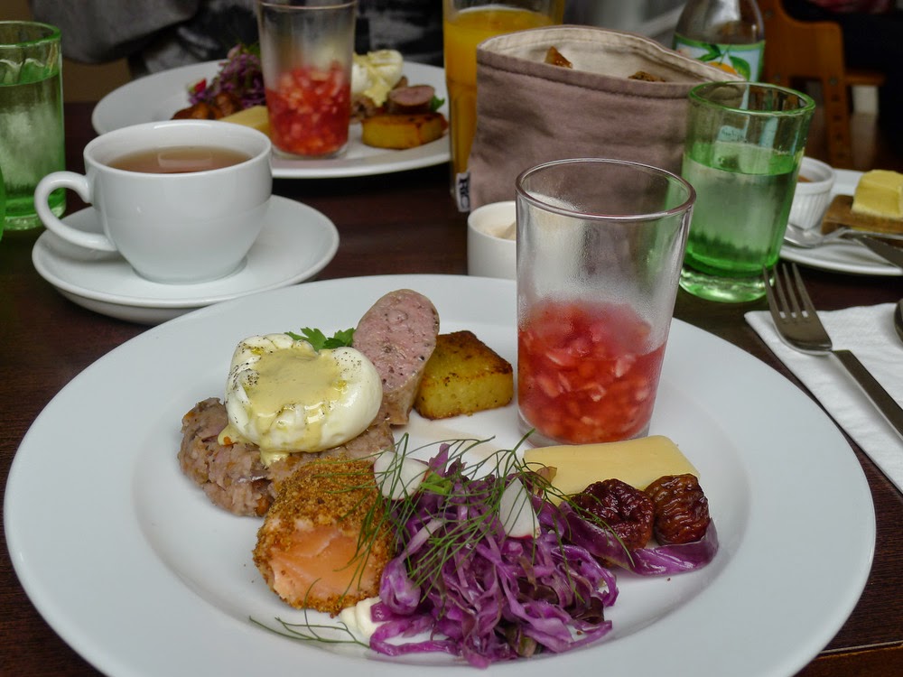 Pour ce dernier jour à Copenhague, nous avons réservé dans un restaurant situé juste en haut de la rue de notre hôtel, et qui selon les guides touristiques propose un des 10 meilleurs brunchs de la ville. Le BioM est un endroit bobo en diable, à la déco épurée et à l’atmosphère très calme le week-end. Deux photos du temple d’Inari encadrent le comptoir – nous nous sentons déjà un peu chez nous avant même de nous asseoir à l’une des tables suffisamment espacées les unes des autres pour qu’aucun client ne soit gêné par la conversation de ses voisins. Et pour l’équivalent de 25€ hors boissons, nous recevons le brunch le plus raffiné, le plus original et le plus joliment présenté que j’aie jamais mangé…
