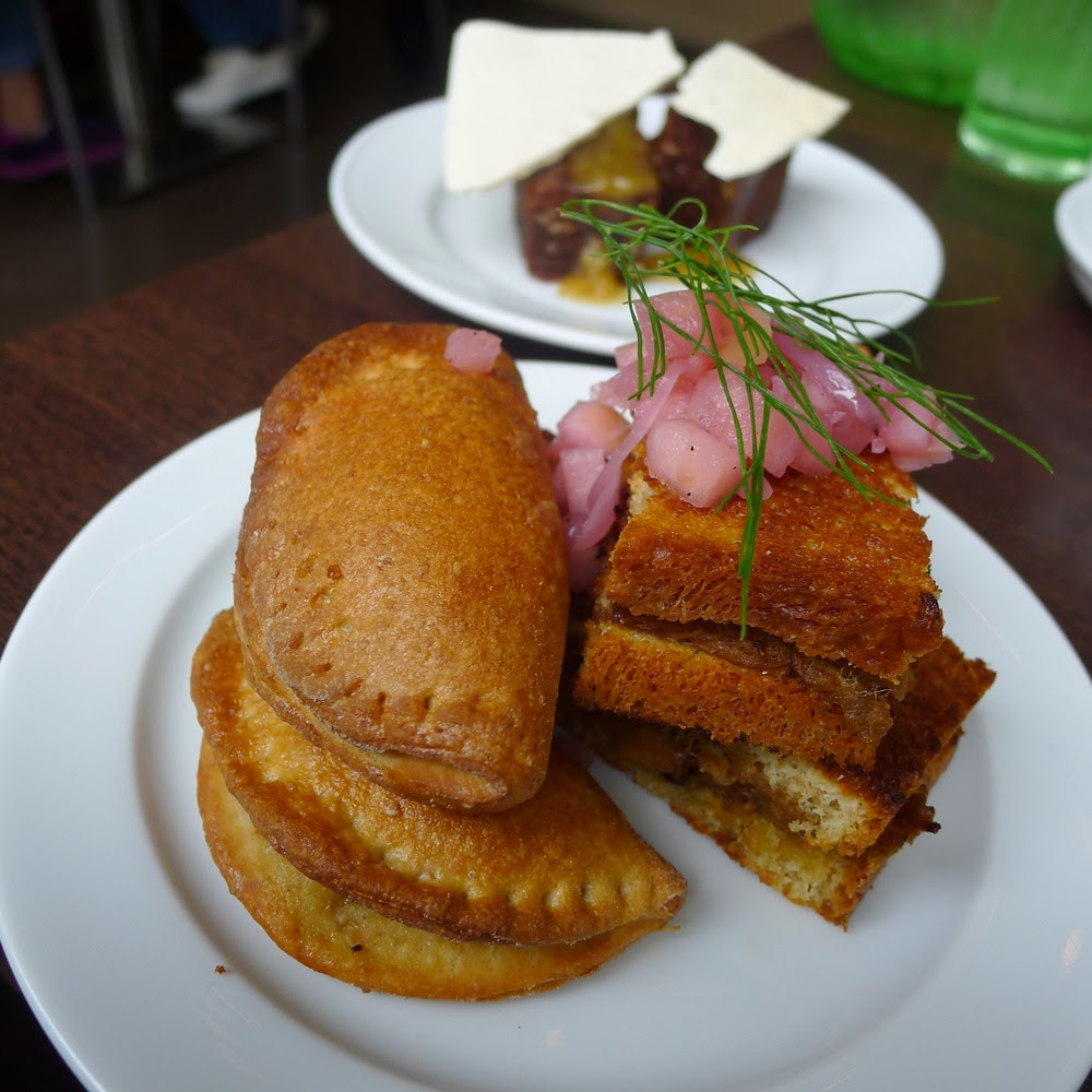 Petite assiette de devant: chaussons aux champignons sauvages, sandwich au pulled pork; petite assiette de derrière: sublime brownie surmonté d’une espèce de meringue pétillante parfumée à je ne sais quoi (le gros mystère de ce brunch)