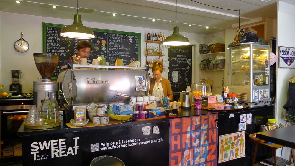 Aux alentours de 9h, cap sur Nyhavn où les restaurateurs commencent à peine à sortir leur terrasse; le pont piéton situé au bout est fermé pour travaux; du coup, nous longeons le canal, ce qui nous donne l’occasion de prendre quelques photos de lieux emblématiques (l’ancien bâtiment des douanes transformé en restaurant, l’ancienne Bourse et son étrange clocher fait de quatre queues de dragon entortillées…); le diner’s prévu pour le petit-déjeuner ne m’inspire pas, allons plutôt chez Sweet Treat qui m’a l’air d’être un repaire de bobos comme je les aime; yaourt+fruits frais+granola = MIAM.