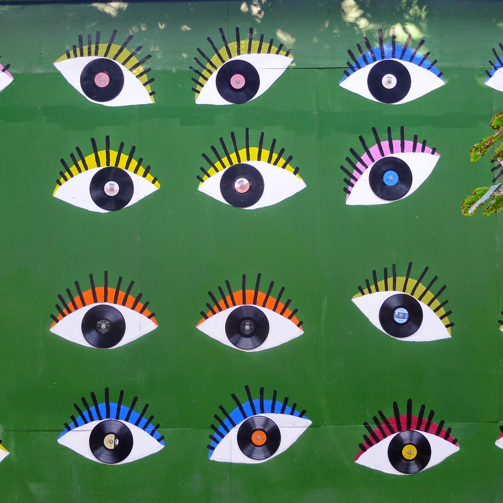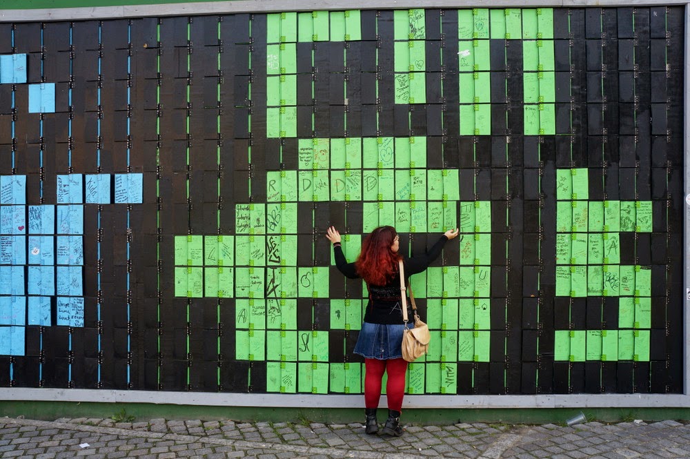 Le Happy Wall se compose de panneaux pivotants, noirs d’un côté et colorés de l’autre, avec lesquels n’importe quel passant peut s’amuser à composer des motifs (souvent des space invaders!)