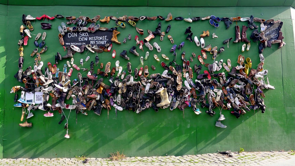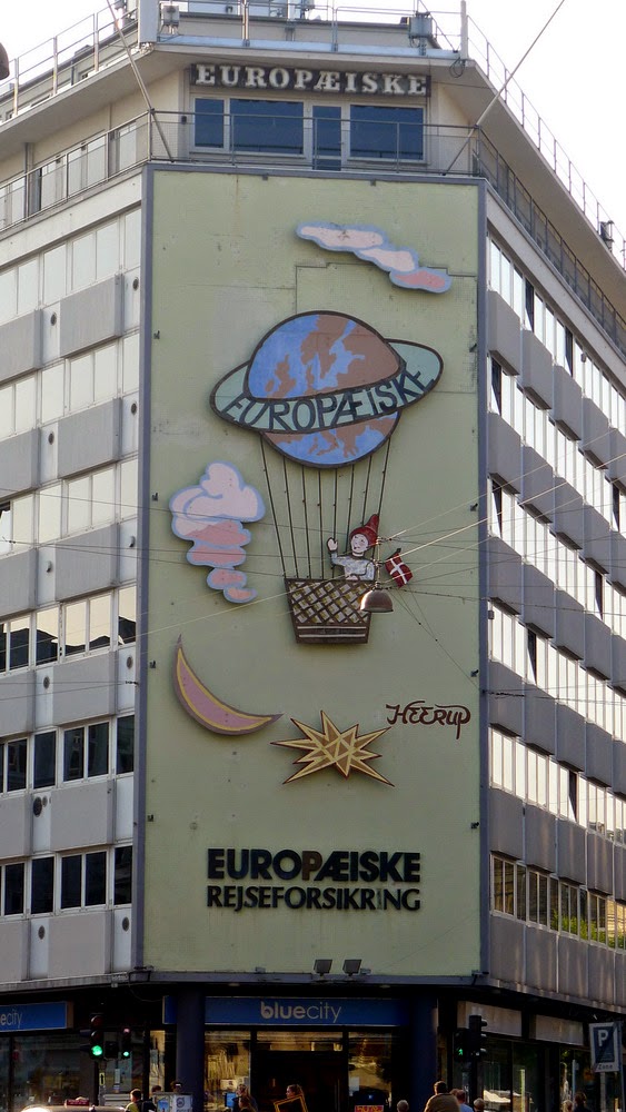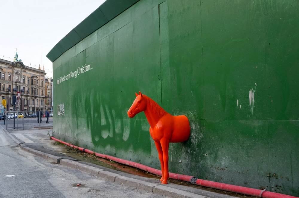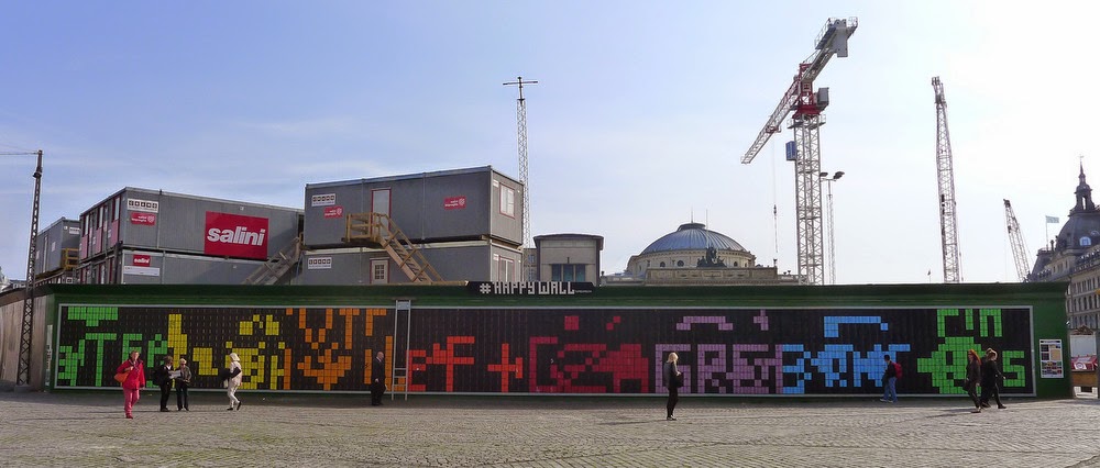 On voit peu de graffiti sauvages dans la capitale danoise, hormis le long des voies de chemin de fer et sur les terrains vagues: les façades des bâtiments en bon état sont toujours respectées. En revanche, la ville est actuellement le cadre de grands travaux qui aboutiront en 2018 à la mise en service de 2 lignes de métro supplémentaires, et un peu partout, les grandes palissades vertes de chantier sont mises à contribution comme support d’installations artistiques. Un vrai plaisir pour les yeux! Premier exemple place Kongens Nytorv, en plein centre-ville, juste à côté du port coloré de Nyhavn: