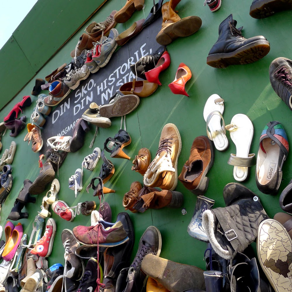 Cette installation de compose de chaussures données par leurs propriétaires, parce qu’elles avaient une place importante dans leur histoire personnelle.