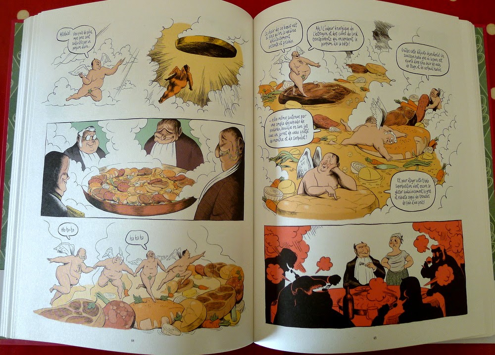 Toujours à l’affût des nouveautés en matière de littérature culinaire, je me suis jetée sur ce beau roman graphique dont le héros haut en couleurs parle de cuisine avec une éloquence lyrique mais se trouve incapable d’aligner deux mots pour avouer ses sentiments à la femme aimée. Qu’il se mettre en fureur devant un repas trop riche ou qu’il sombre dans une déprime barbue et alcoolisée quand Adèle lui annonce son départ, il reste toujours éminemment sympathique, et on souhaite de tout coeur qu’il l’emporte à la fin. J’ai craqué pour le dessin de Mathieu Burniat, qui n’hésite pas à représenter de dignes notables sexagénaires sous la forme de chérubins ventripotents se vautrant nus dans un sublime pot-au-feu. Une oeuvre gourmande pleine de charme et d’énergie (dont le papier et l’encre sentent en outre merveilleusement bon).